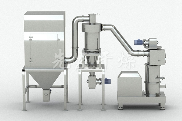 JCFJ系列内分级机械粉碎机主要机构由固定在粉碎转盘外周上的冲击锤块与衬板组成的粉碎室部件,通过传动带与驱动电机相连,水平地安装在机架上;粉碎室中部装有进气管;蜗轮分级机与排气管构成的分级室部件置于粉碎室筒体的上方;分级室与排气管端面设有气封隔离,以阻止粗粉进入成品,在转子滚动轴承前置有气封保护,以防止微粉进入滚动轴承。整个装置简洁、紧凑。粉碎时,待粉碎物料由送料装置均匀送到分级室,在这里进行预先分级,原料中的合格颗粒经分级后从排气管排出,粗颗粒进入粉碎室,在冲击锤块的高速冲击和研磨作用下被粉碎,粉碎后的物料经进气管进入的上升气流作用下输送到蜗轮分级机进行先分级,合格颗粒经分级后从排气管随尾气一起排出后收集为产品,粗颗粒再次返回粉碎室继续粉碎。产品收集部分由旋风分离器和脉冲除尘器及离心风机组成,将粉碎合格的产品收集。