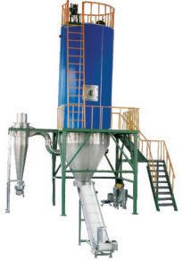 洁净空气加热后进入干燥塔,在塔内热风中用二流体(或三流体)喷嘴将各种料液物化成微小液滴,与热风进行快速热交换,蒸发掉液料中的水份(或溶剂),并随热风排出,获得粉状产品。