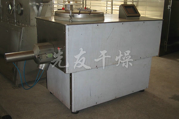 粉体物料与粘合剂在圆筒形容器中由底部混合浆充分混合成湿润软材,然后由侧置的高速粉碎桨切割成均匀的湿颗粒。